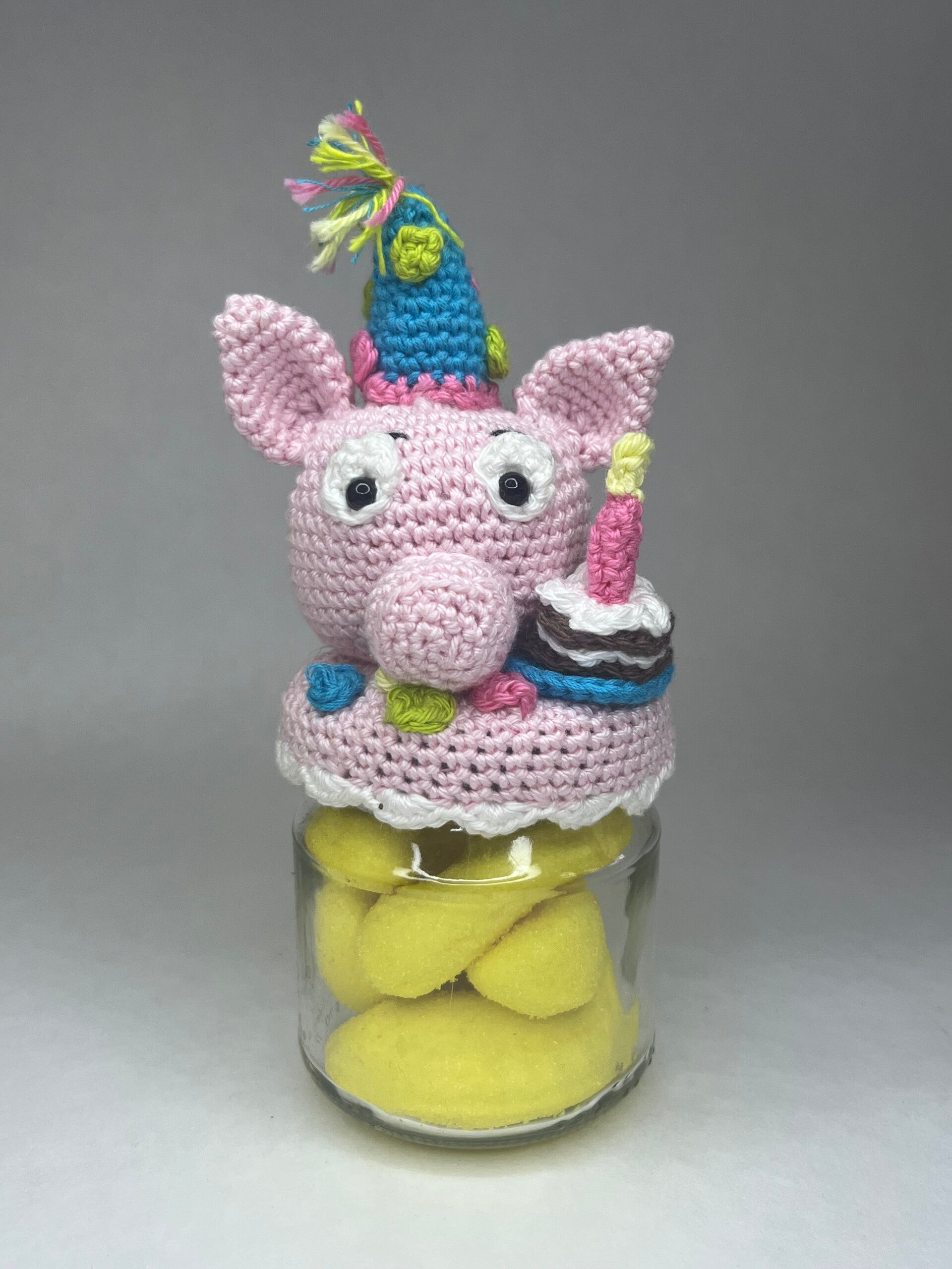 Feestje!! leuk om cadeau te geven een gehaakt feestvarken snoeppotje